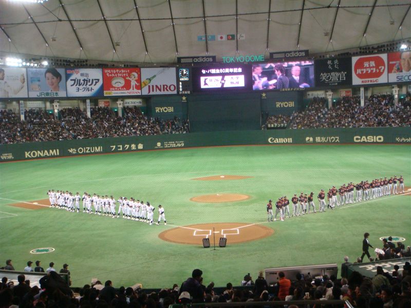 見事ストライクでキャチャーミットに吸い込まれました。跡で聞いたところブルペンで投げ込んできたようです。国会で忙しいと思う が普段から運動をしているのだろうか、良い球投げるのに感心した。試合は両チームとも1回で交代するのでなかなか打てず、1対1の 引き分けであったが斉藤祐樹やプロの若手の等級に満足して東京ドームを後にした。