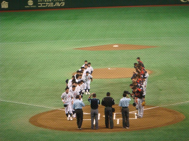 試合開始の挨拶はアマチュア流にホームベースをはさんで行っていました。プロとアマの交流戦らしいですね。