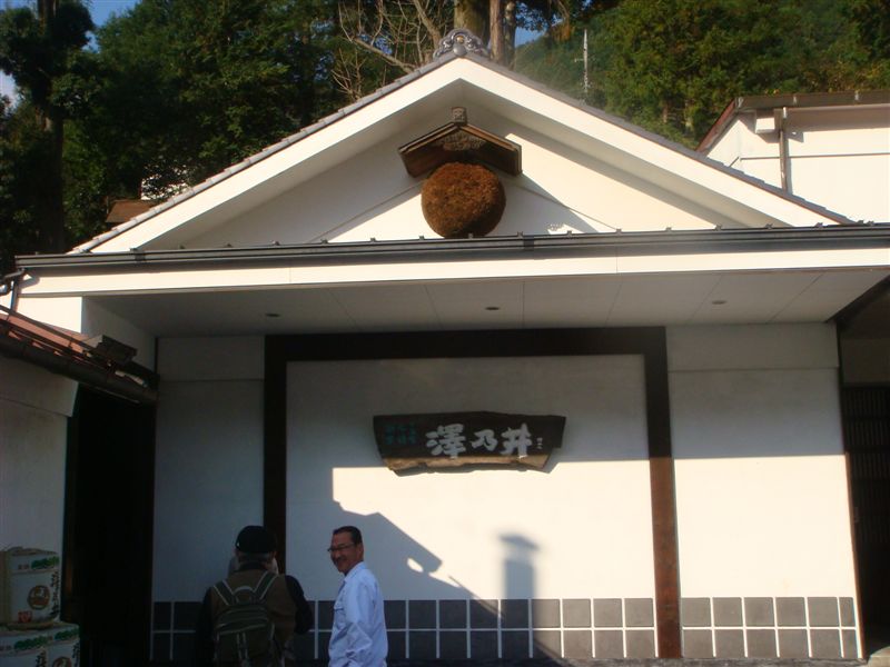 入り口には萱葺き屋根の立派な家があります。社長さんの家かな?蔵の正面です。軒下に杉のまるい飾りがありますね。これは新酒が出来た時に青い杉の球を飾り新酒が飲めますとのサインだそうだ。今は新種の仕込み中なので去年の杉球なので茶色です。12月になったら青いのが見れるのでしょう。