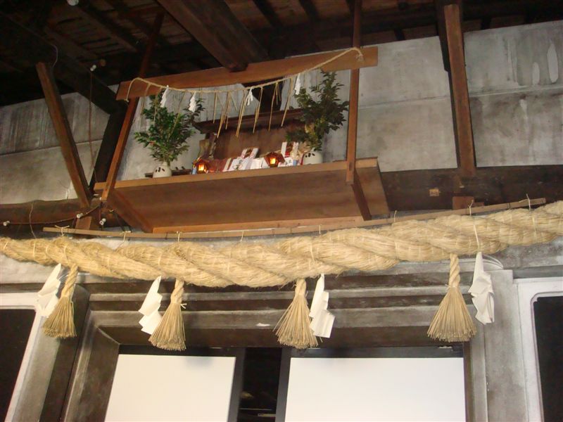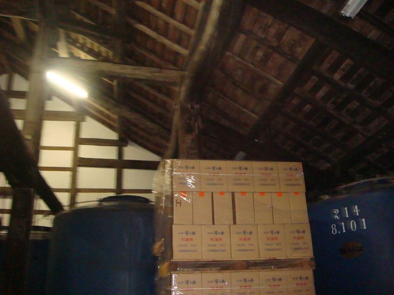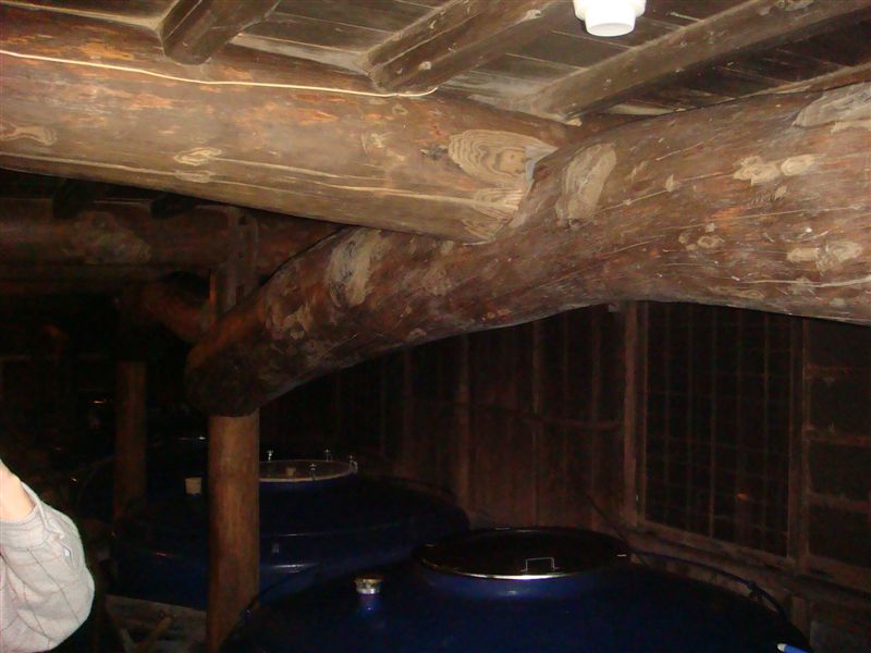 蔵の入り口には神棚があります。この蔵は一番く元禄蔵(創業当時の蔵)と呼ばれているそうです。中の梁なども立派です。ここは明治蔵だそうですが歴史を感じる建物です