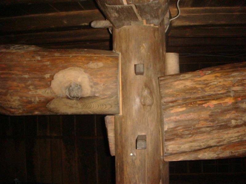 別の建物の梁を見せてもらいました。曲がった柱とまっすぐな柱で組み合わせている珍しい梁です。いいもの見せていただきました。