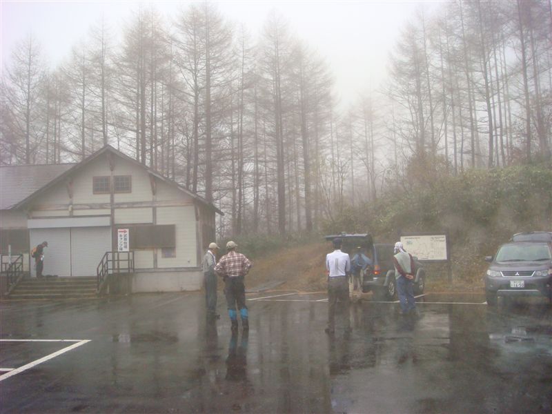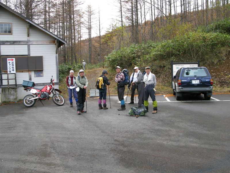 宿のペンションから東俣駐車場に到着した。武尊牧場のスキー場からの東俣駐車場へは通行止めのはずだがあやしいバイクの先導でないしょの山道を抜け無事登山口に。身支度を整えて上州武尊山山頂往復へ9:00出発です。