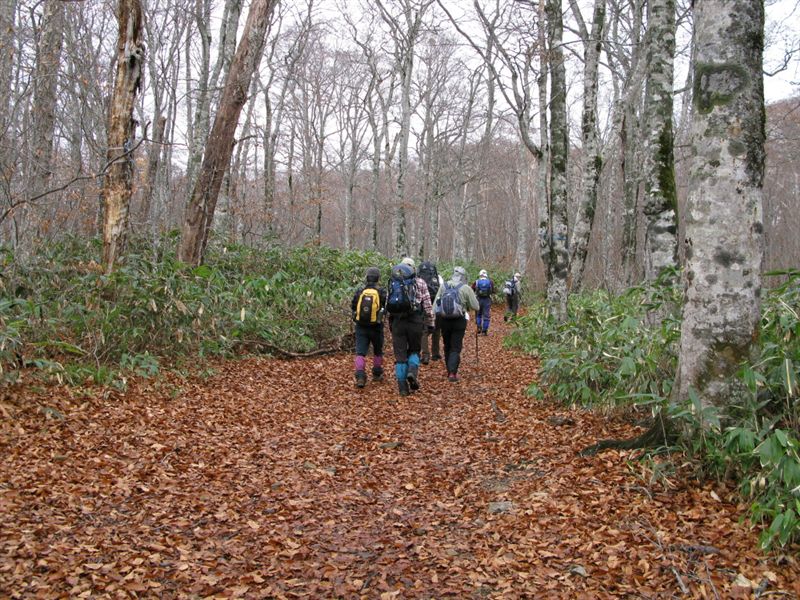昨夜の雨も上がり薄日が差しているが今日も天気は冬型になり荒れそうな感じである。装備を万全にしてブナ林の中を登っていくことにした。