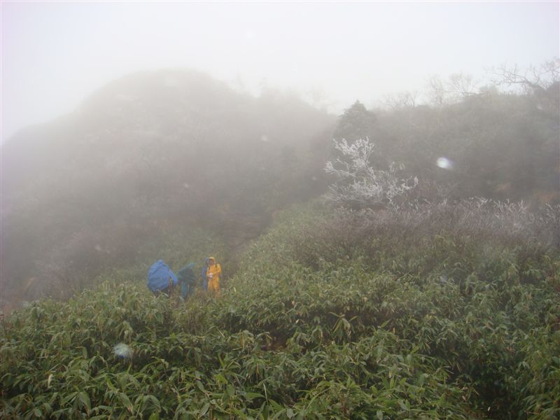 中ノ岳手前では風雨が強まりこれから先は岩場や鎖場があり稜線では強風にあおられそうであったので山頂まであと30分というところで撤退を決めた。木には霧氷がついて白くなっている。サムI~~い。撤退記念写真を撮影して下山です。