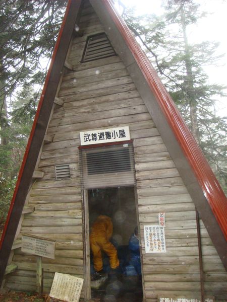 お腹がすきました。12:00に非難小屋に到着しました。霰になってとても寒くいのでこの中で昼食を取ることになりました。あまりきれいではありませんが助かります。