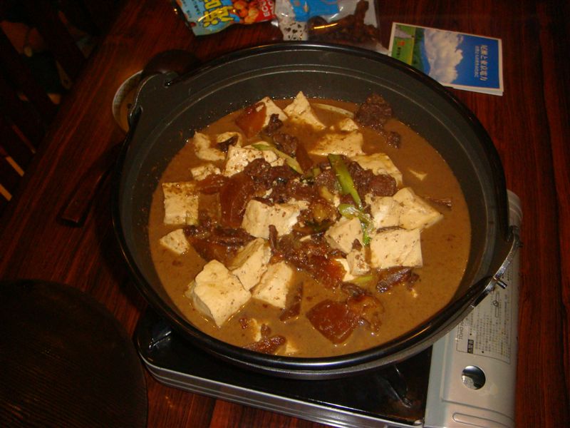 至仏山を登って暗くなっての到着ですが暖かいなべを囲んでの大宴会初日のスタートです。オーナーが射止めた鹿の背ロース生肉をいただきました。小鹿と親鹿の味と食感の違いがあると・・・(ちょっと分からなかった)でもとても柔らかで癖のないお肉です。盛りだくさんのお料理に舌鼓を打ちながら・・・・