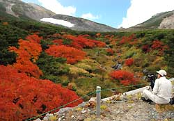 9月4日の日記で紅葉100名山を選ぶ(ここ)を書いたが北アルプスの山の紅 葉状況がどんどん入ってきている。北海道大雪山系はそろそろ紅葉も終わりの頃だろうか。北アルプス乗鞍岳(3026m)ではナ ナカマドやダケカンバが色づき、紅葉が進み例年より10日ほど早く見ごろを迎えているとあった。22~23日に行った西穂高で も紅葉綺麗だった。(その時の日記はここ)乗鞍では熊が観光客らを襲い9 人が重軽傷を負う事件が起きたばかりなので熊よけの鈴をつけてる登山客が多いそうだ。でも、もともと熊の生息地なのでそ こに人が入ってきているという認識を持っていないといけないのだろう。私も教養登山を計画しよう。