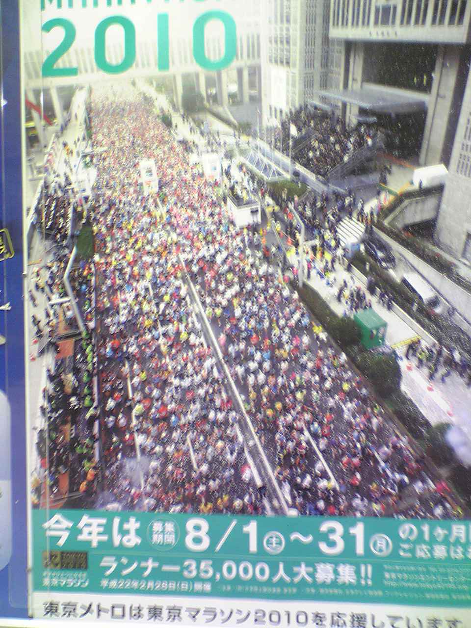 そろそろ来春の東京マラソン2010のエントリーが開始だと思っていたが地下鉄に案内が張り出されていた。(写真参照)今年の 申込期間は8/1~8/31と短くなっている。(昨年は7/27~9/22だからかなり短い)2010の定員はマラソン:32,000人、 10km:3,000人(2009の定員はマラソン:30,000人、10km:5,000人)マラソンは増えたが10Kmは減っている。昨年までの応募状 況を踏まえて変更になったのだろう。公式HPはこちらです。すでに3年連続抽選はずれになって いるが今回もだめもとでエントリーしておこう。10月中旬に抽選発表なので当選したらマラソントレーニングに励むこととしよう。 さて結果は・・・