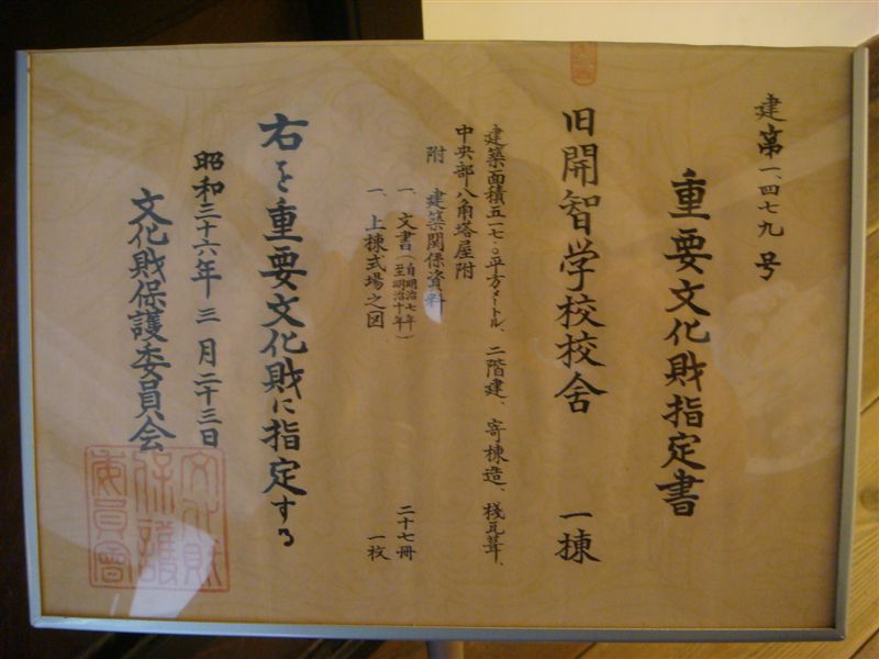旧開智小学校の重要文化財指定の証書です。明治6年(1873)5月に開校され、校舎は明治9年4月に新築され昭和38年まで90年間使われていたそうです。