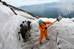 明日7月1日の山開きを控えている富士山が例年にない残雪に覆われているようだ。、山小屋の関係者が登山道の雪かき作業を22日から行ない山頂まで終わったがまだ標高約3400メートルの8合目付近でも、多いところで約2メートルの積雪があり難航したとのこと。登山道以外、山頂は同じくらいの残雪があると山小屋関係者の話もある。登山道を管理する山梨県は29日に現地調査をし場合によっては、登山規制の可能性もあるらしい。 山開きが行われ登山者が多くなって雪崩など起きないことを祈るばかりだ。登山予定者の人は装備をしっかりして注意して登ってくださいね。写真は雪掻きをする山小屋関係者(朝日新聞より)