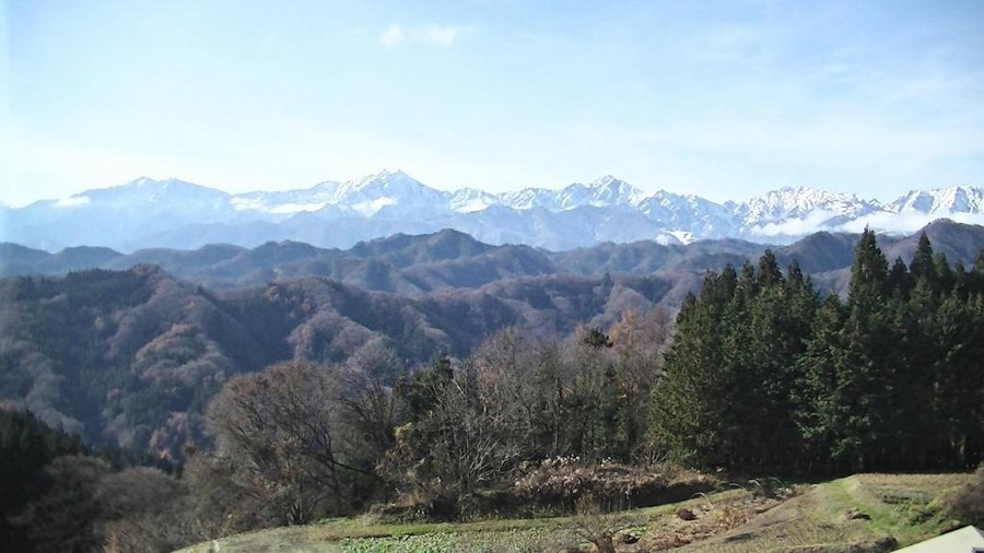 長野県小川村にあるアルプス展望広場からは晴れた日は右から乗鞍岳、小蓮華岳、白馬岳、杓子岳、白馬鑓ケ岳と続いて爺ケ岳、針ノ木岳、蓮華岳などまで一望できる見晴らしが「絶景」として知られていますが私はまだ行ったことがない。