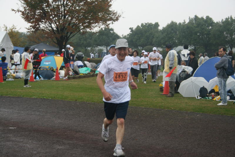 朝から雨が降り出して今日のマラソンは走りたくなかったが会場まで行って雨の様子で決めることにした。会場に到着しても雨がやまず一応着替えをして準備をしていたら雨はやみ走ることにした。10Kmだがロードでの練習をしていなかったのできつかったが完走できた。写真はゴール300mくらいの地点であるがアップアップある。