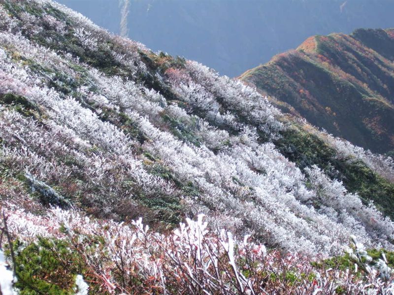 写真のように真っ白く霧氷が着いている。紅葉とのコンラストがとてもきれいだった。