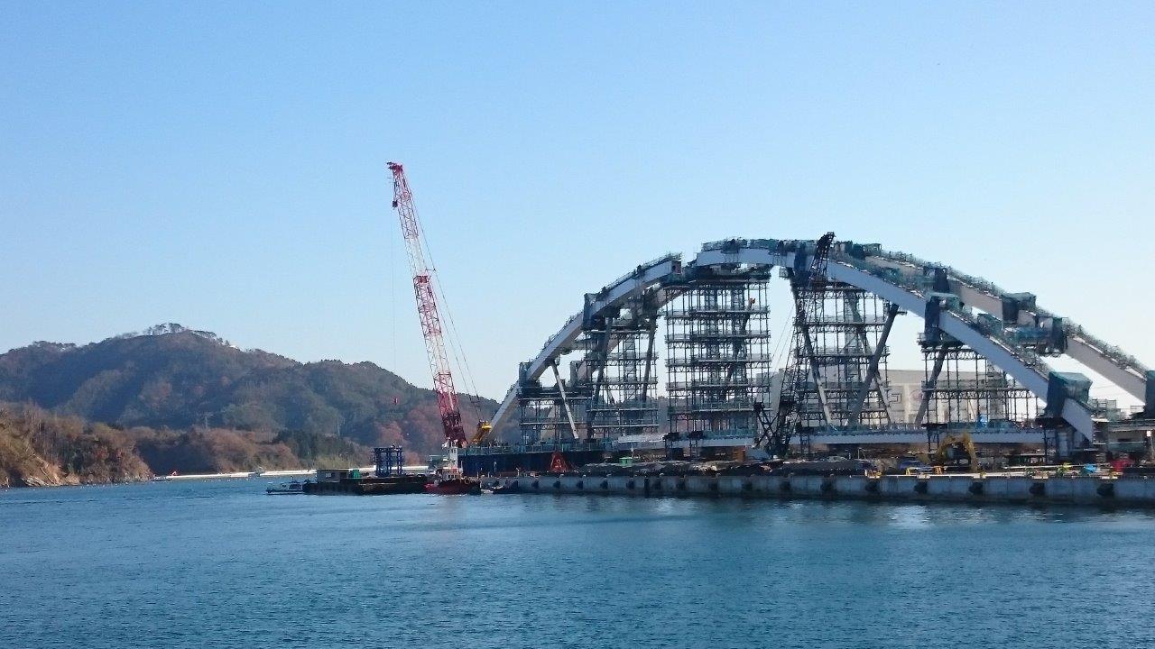 埠頭では平成30年度に陸と島を結ぶ鶴亀大橋の組み立てが行われました。組み上がると3000トンのクレーン船で釣り上げて台座に運ぶそうです。そして大島が近づいてきました。