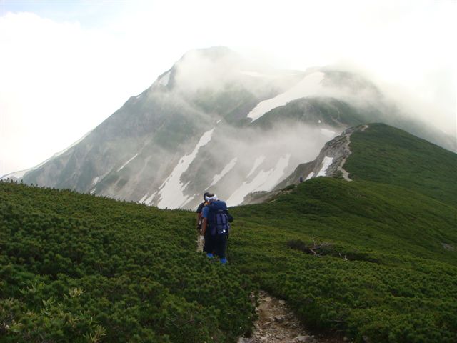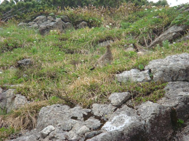 途中親子の雷鳥のお出迎えもあり疲れが取れてくる。双六方面との分岐に出ると尾根道となりやっと楽になる。ガスが出始めているが太陽がさえぎられてほてっていた体も下がってきて気持ちがいい。