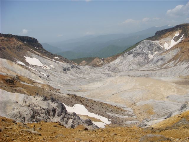 沼平を眼下に見ながら安達太良山頂を目指します。荒涼とした眺めです。沼平コースは硫化ガスの事故があったため現在は立ち入ることが禁止されています。でもちょっと歩いてみたい感じでした。
