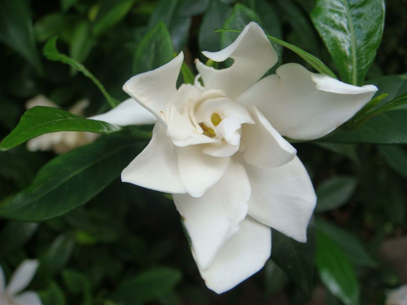 どこからともなく甘い香りが漂ってくるくちなしの花。アメリカでは若い男性が女性をダンスパーティーに誘う前に胸飾りとして花屋から届けさせる花だそうです。一重咲きと八重咲きがあり、美しさでは八重咲きが好まれてますが、料理や漢方薬などに使われる実ができるのは一重咲きの方らしい。ということはこれは実がなりそうですね。実がなったら頂いちゃおうかな・・・