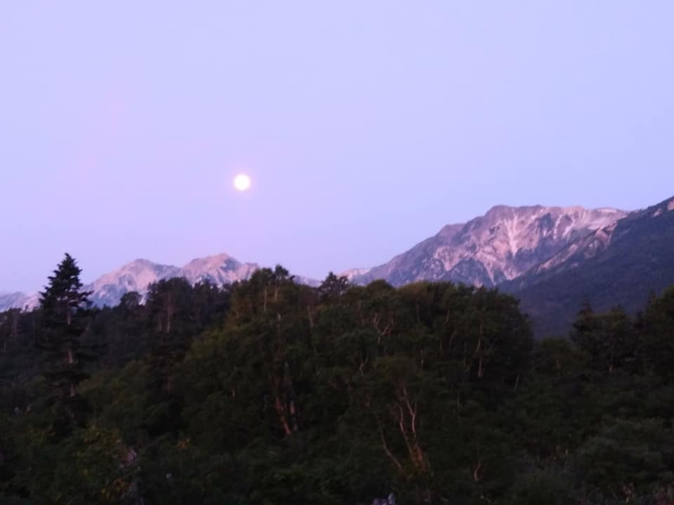 翌朝は鹿島槍、杓子の上に月齢15.4の月が沈むところでした。