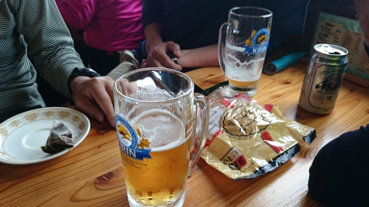 久しぶりの縦走で足に疲れが出ていて下るのに往生しましたが中房温泉に到着し、温泉に入ってから今回の縦走の成功を祝って乾杯です。